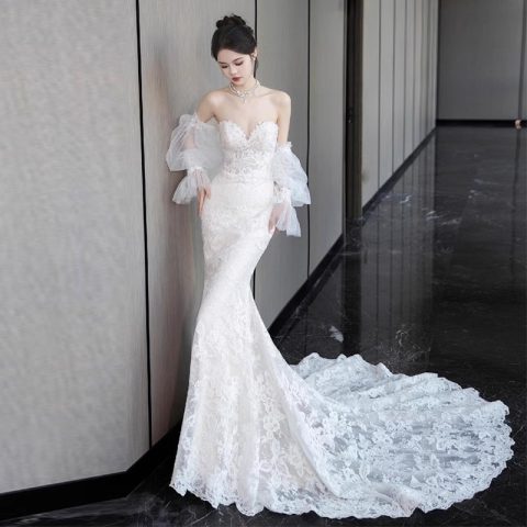 新款蕾絲包臀魚尾長袖婚紗禮服小拖尾出門紗法式輕紗晨袍主持